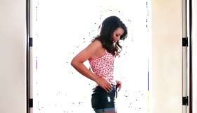 Soft dark-haired hottie is taking her seductive petticoat off and is posing bare while penetrating the highly juicy cunt of her
